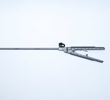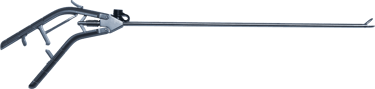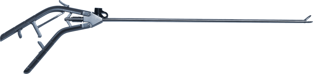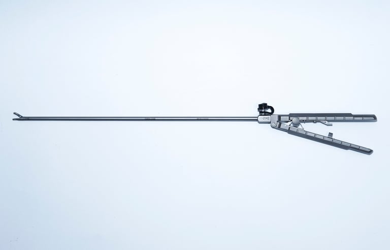 O porta agulhas é utilizado para segurar, controlar e direcionar a agulha durante a sutura de tecidos dentro da cavidade abdominal, essencial em procedimentos minimamente invasivos.